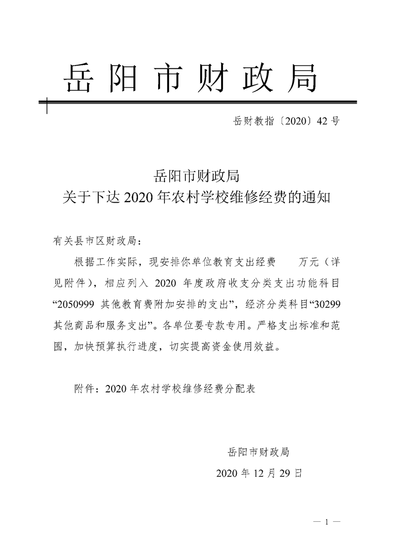 岳阳市财政局关于下达2020年农村学校维修经费