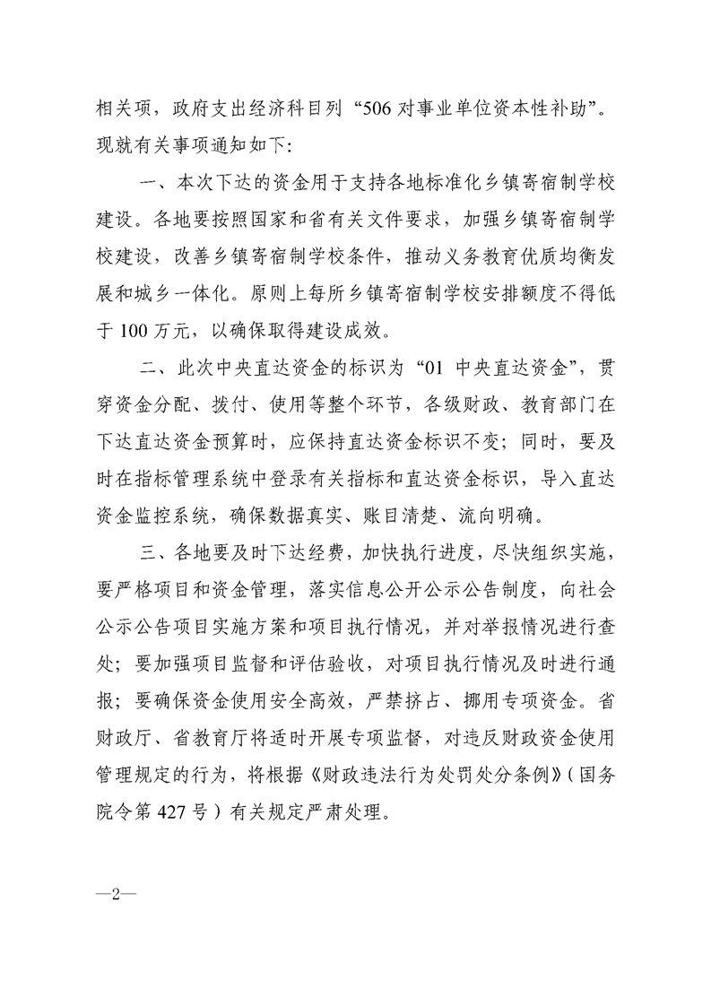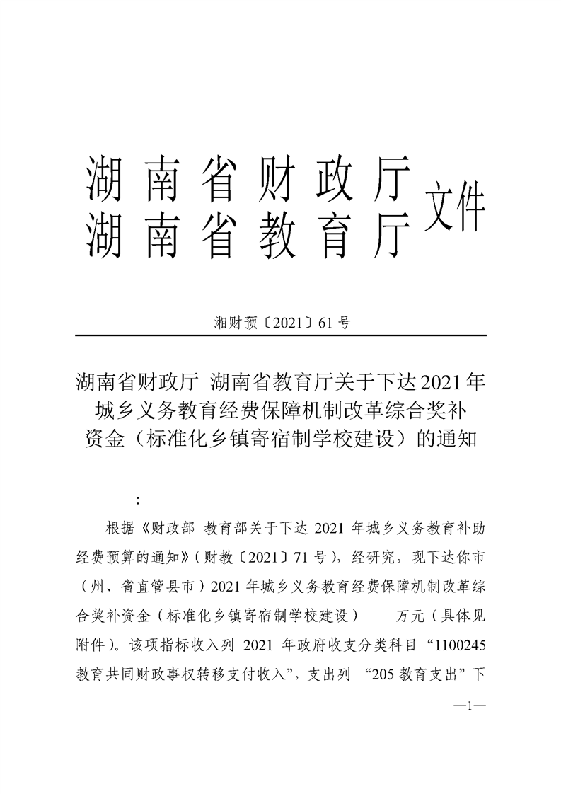 关于下达2021年城乡义务教育经费保障机制改革综合奖补资金(标准化乡镇寄宿制学校建设)的通知