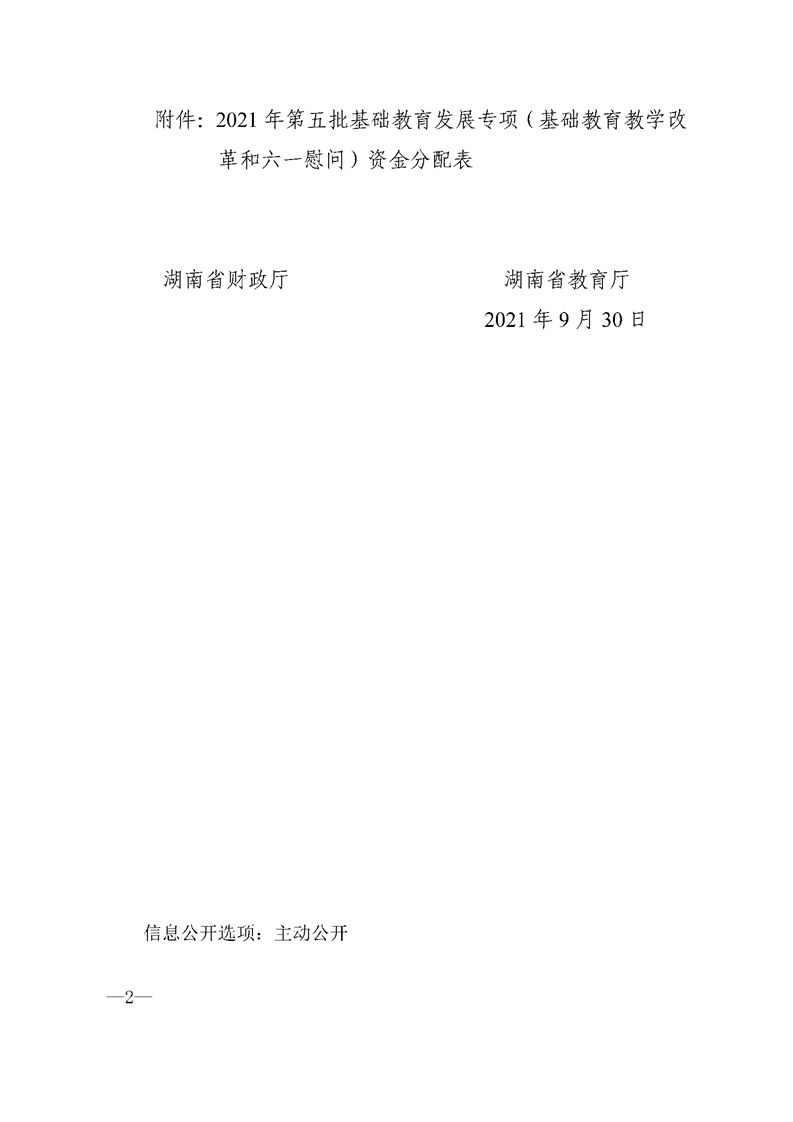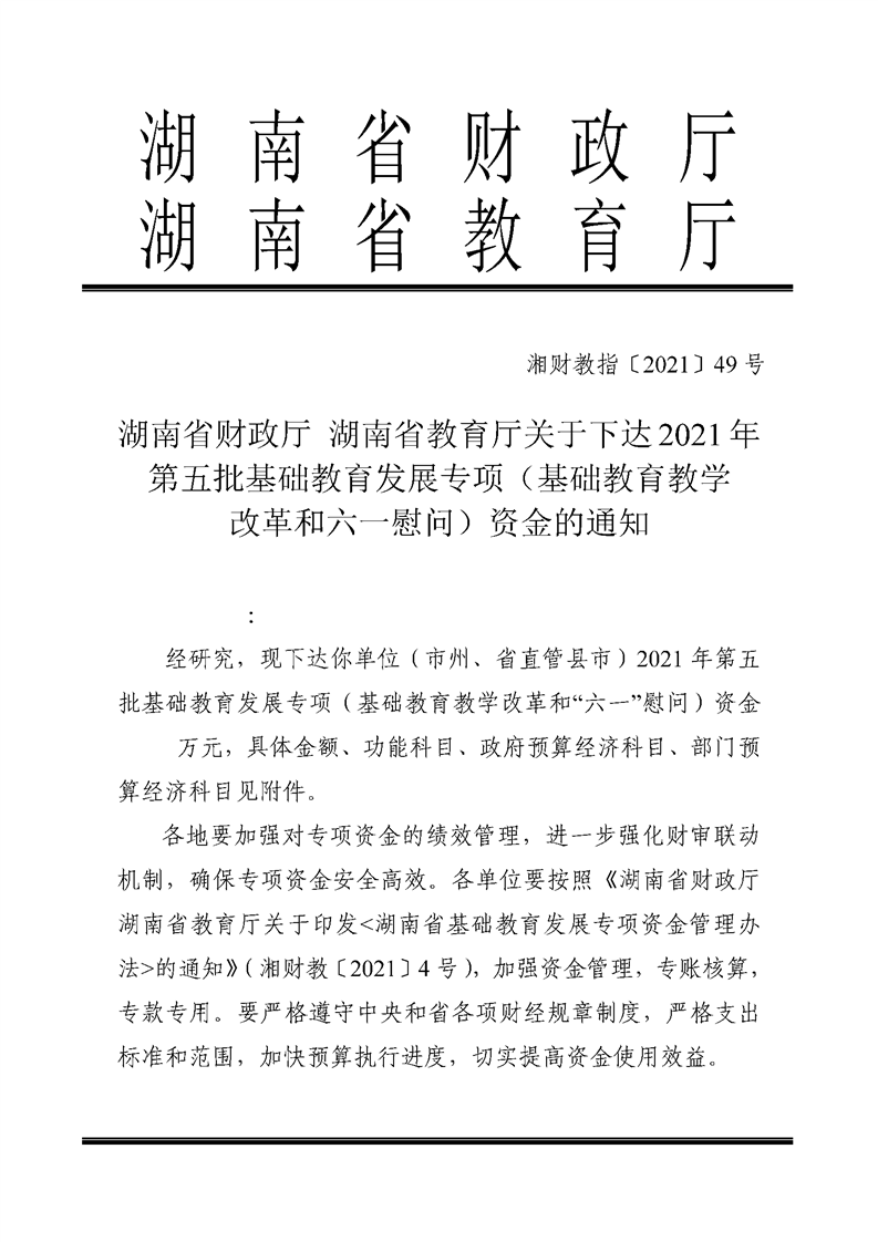 关于下达2021年第五批基础教育发展专项(基础教育教学改革和六一慰问)资金的通知