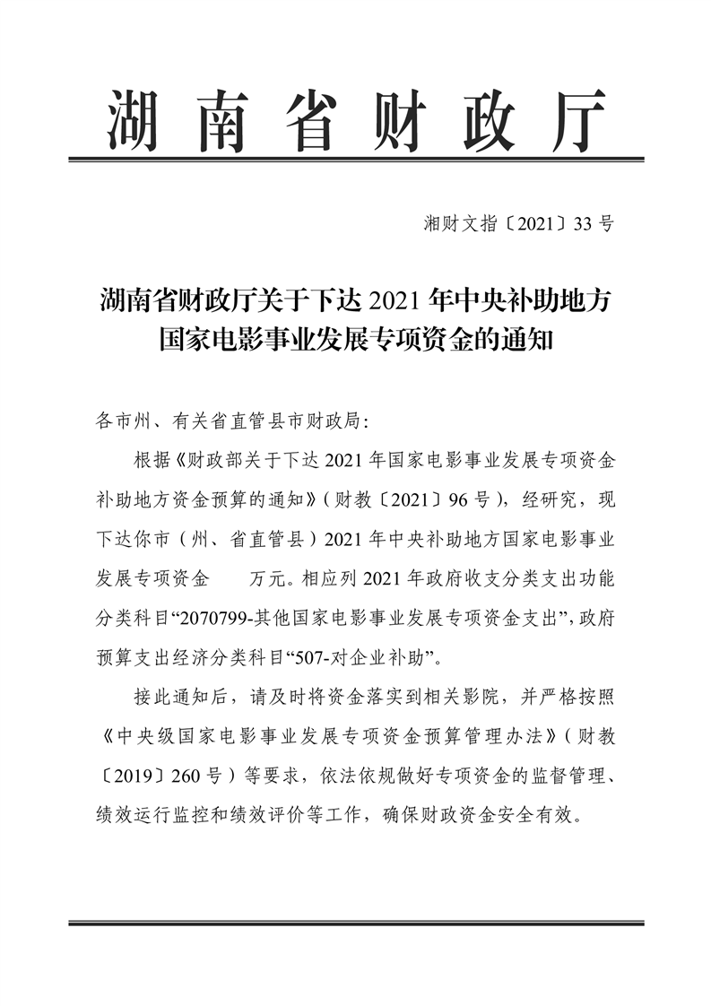 关于下达2021年中央补助地方国家电影事业发展专项资金的通知