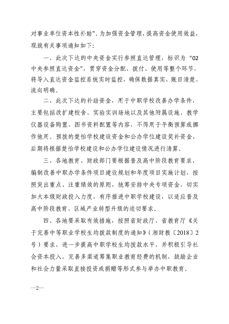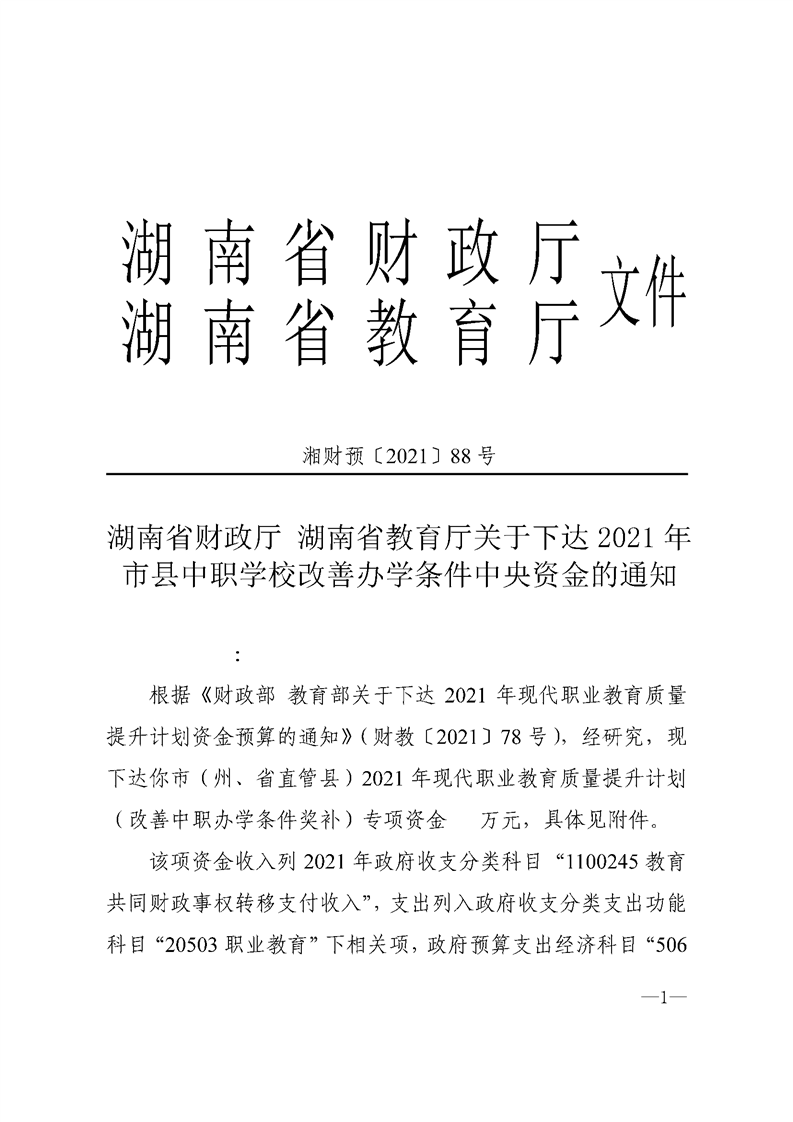 湖南省财政厅 湖南省教育厅关于下达2021年市县中职学校改善办学条件中央资金的通知