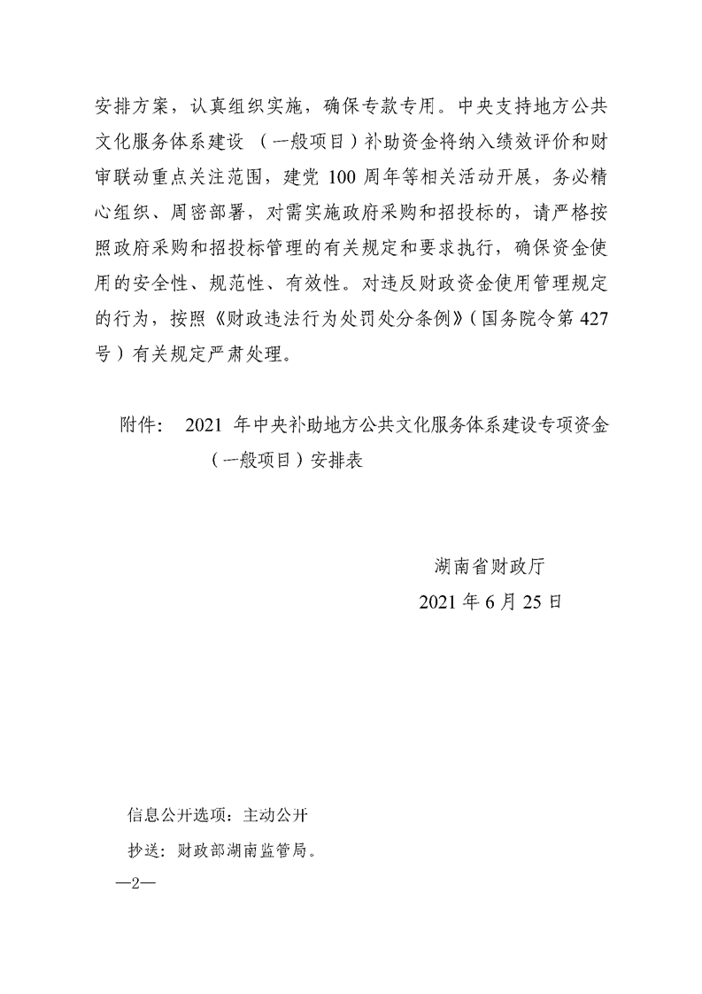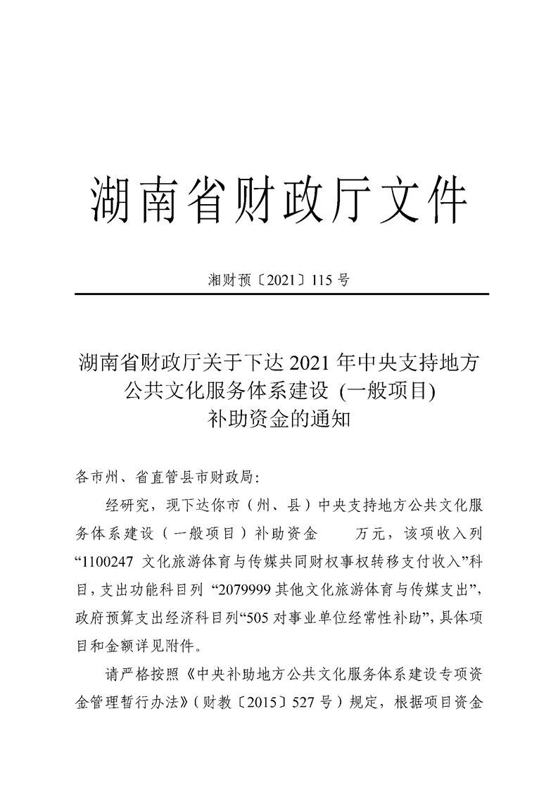 湖南省财政厅关于下达2021年中央支持地方公共文化服务体系建设 (一般项目)补助资金的通知