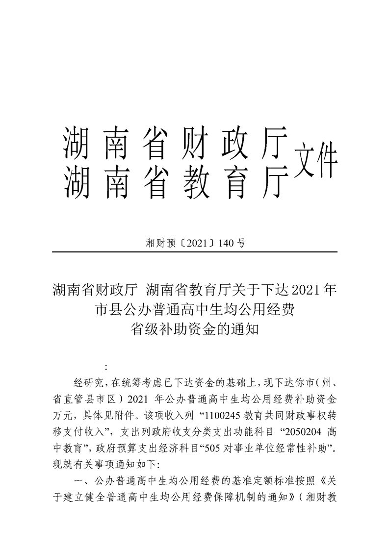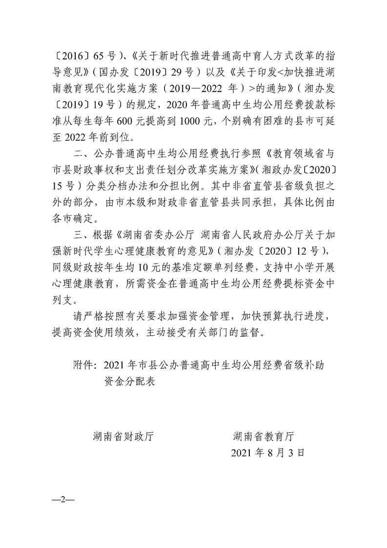 湖南省财政厅 湖南省教育厅关于下达2021年市县公办普通高中生均公用经费省级补助资金的通知