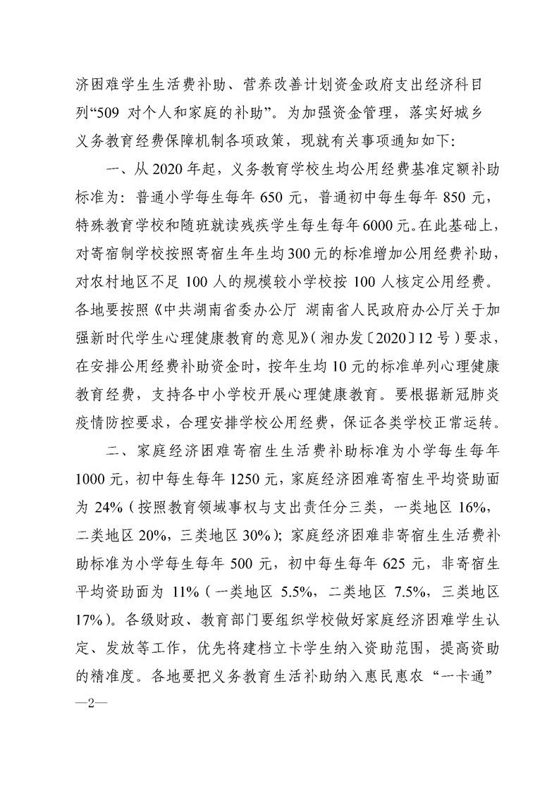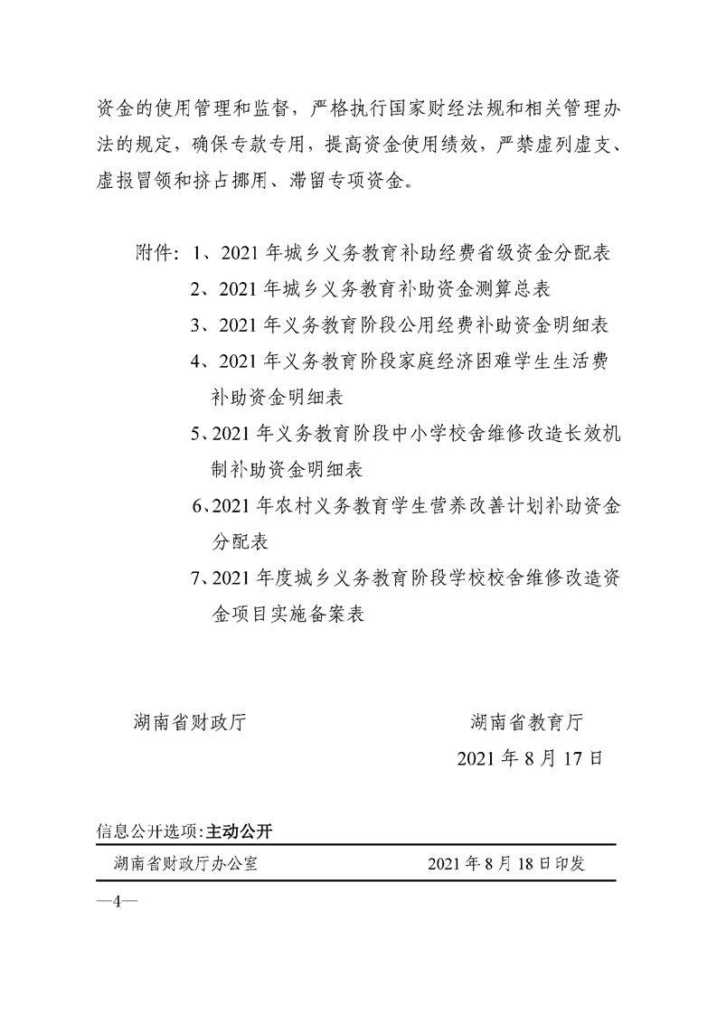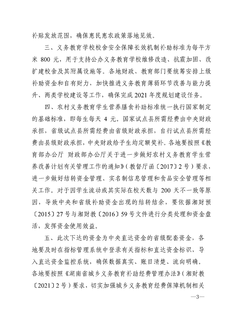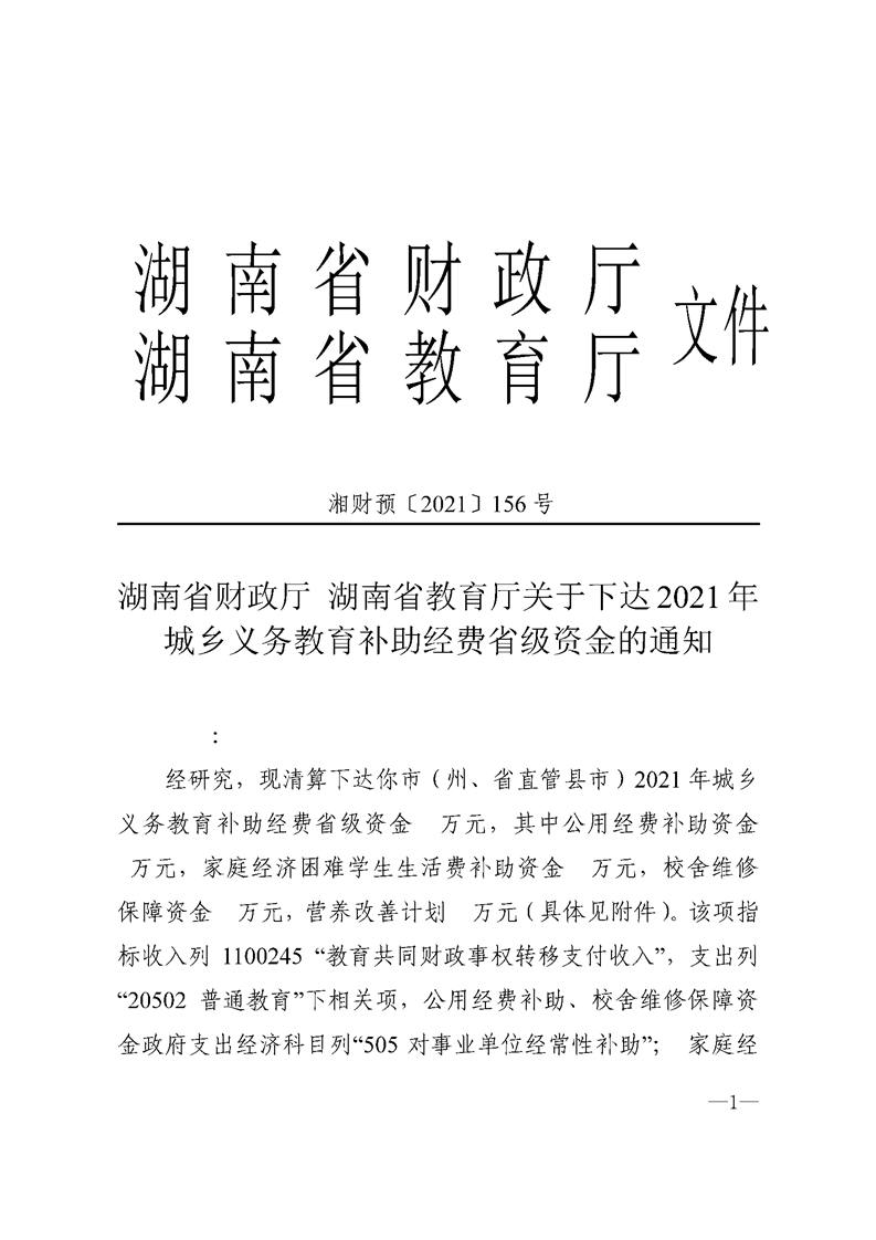 湖南省财政厅_湖南省教育厅关于下达2021年城乡义务教育补助经费省级资金的通知