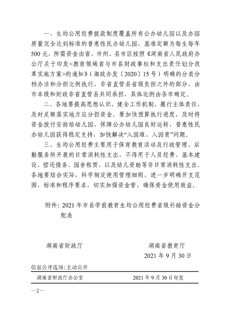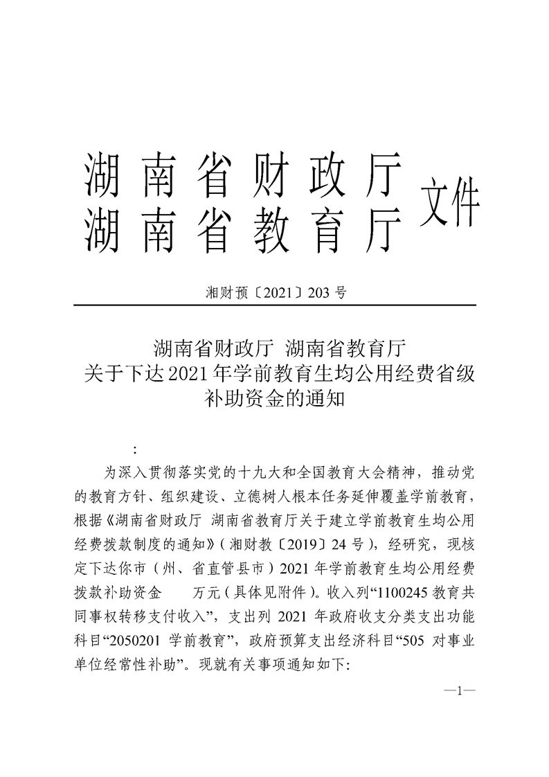 湖南省财政厅_湖南省教育厅关于下达2021年市县学前教育生均公用经费省级补助资金的通知