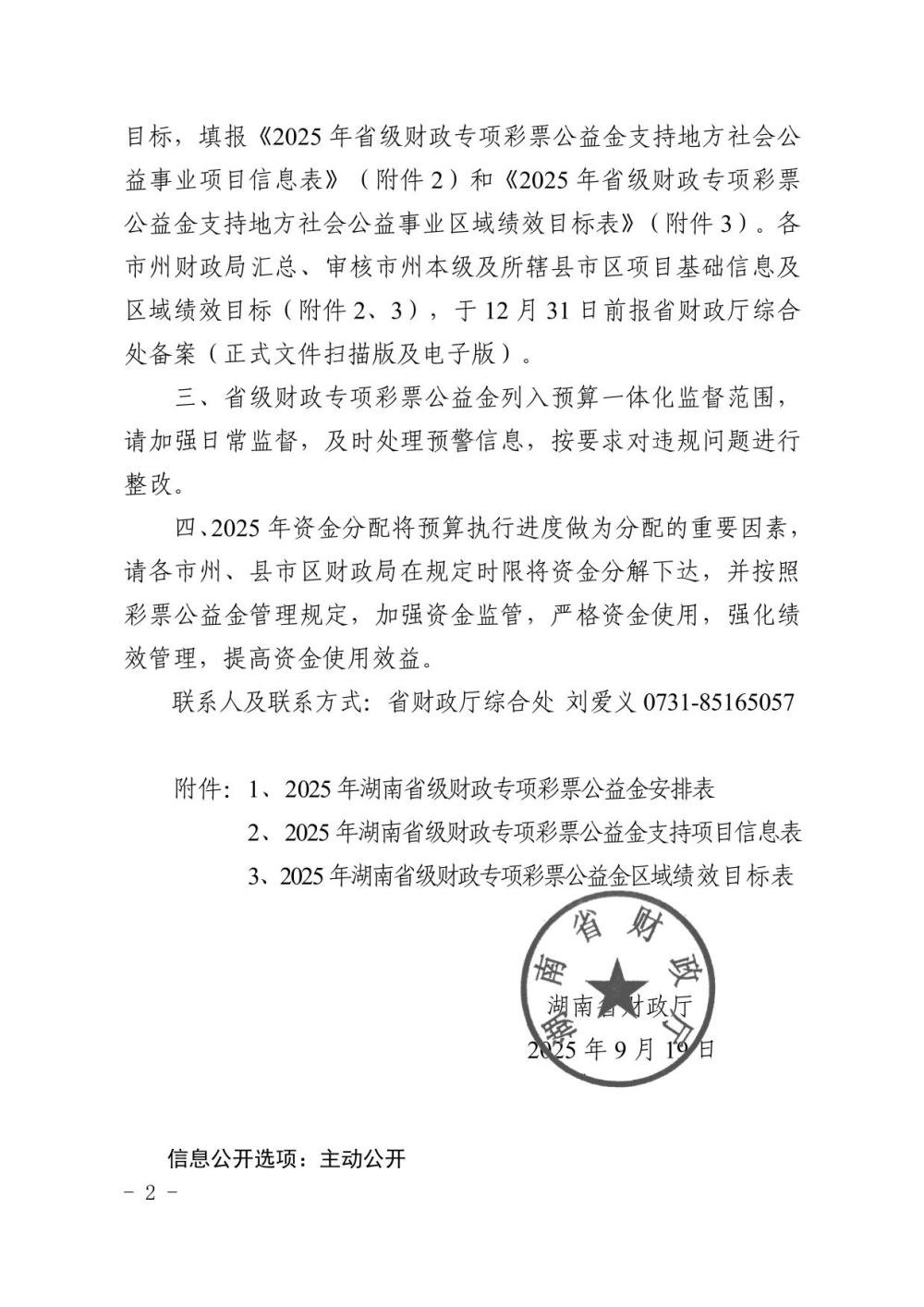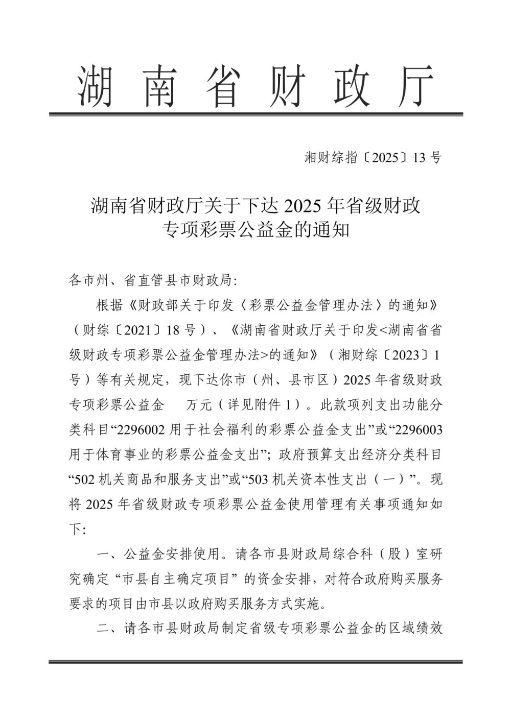 湖南省财政厅关于下达2025年省级财政专项彩票公益金的通知