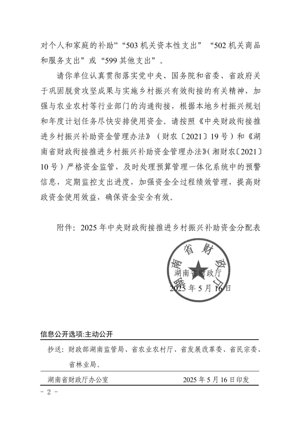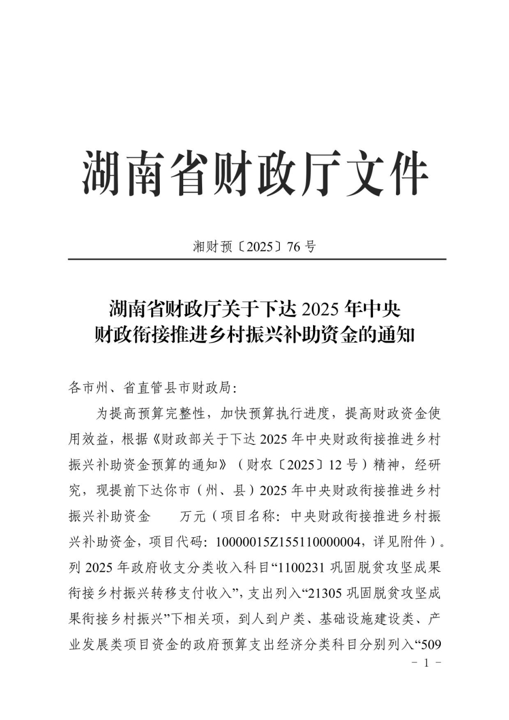 湖南省财政厅关于下达2025年中央财政衔接推进乡村振兴补助资金的通知