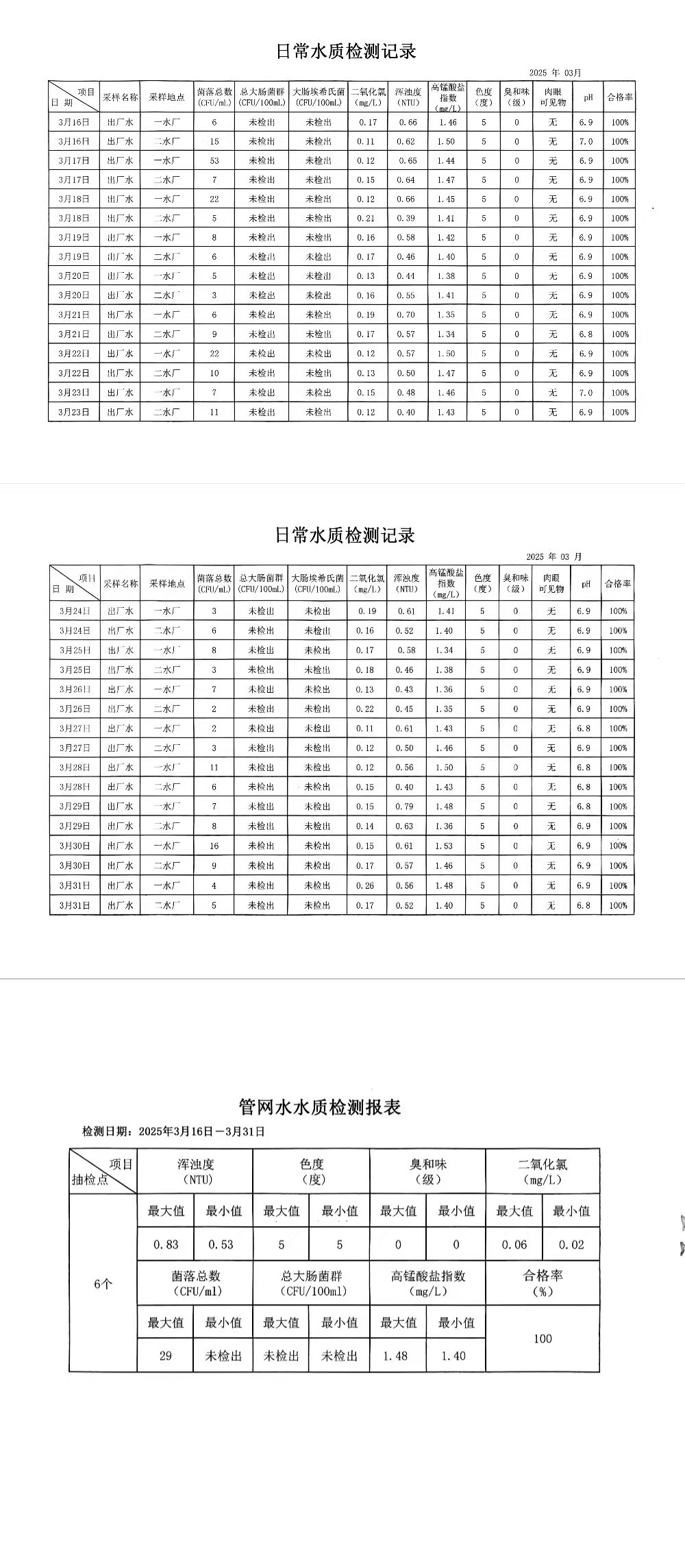 3月下半月兴临自来水公司日检、半月检水质信息公开