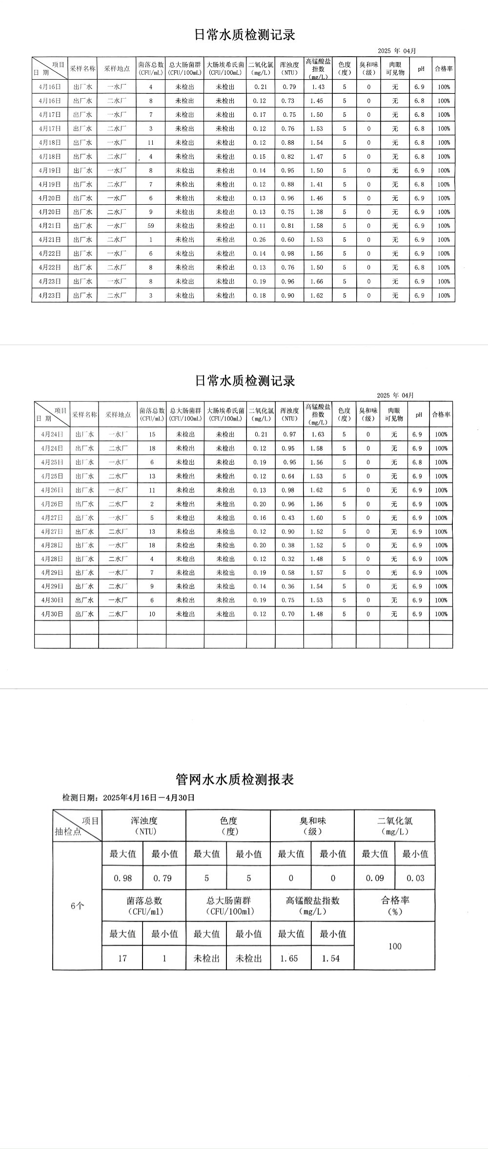 4月下半月兴临自来水公司日检、半月检水质信息公开