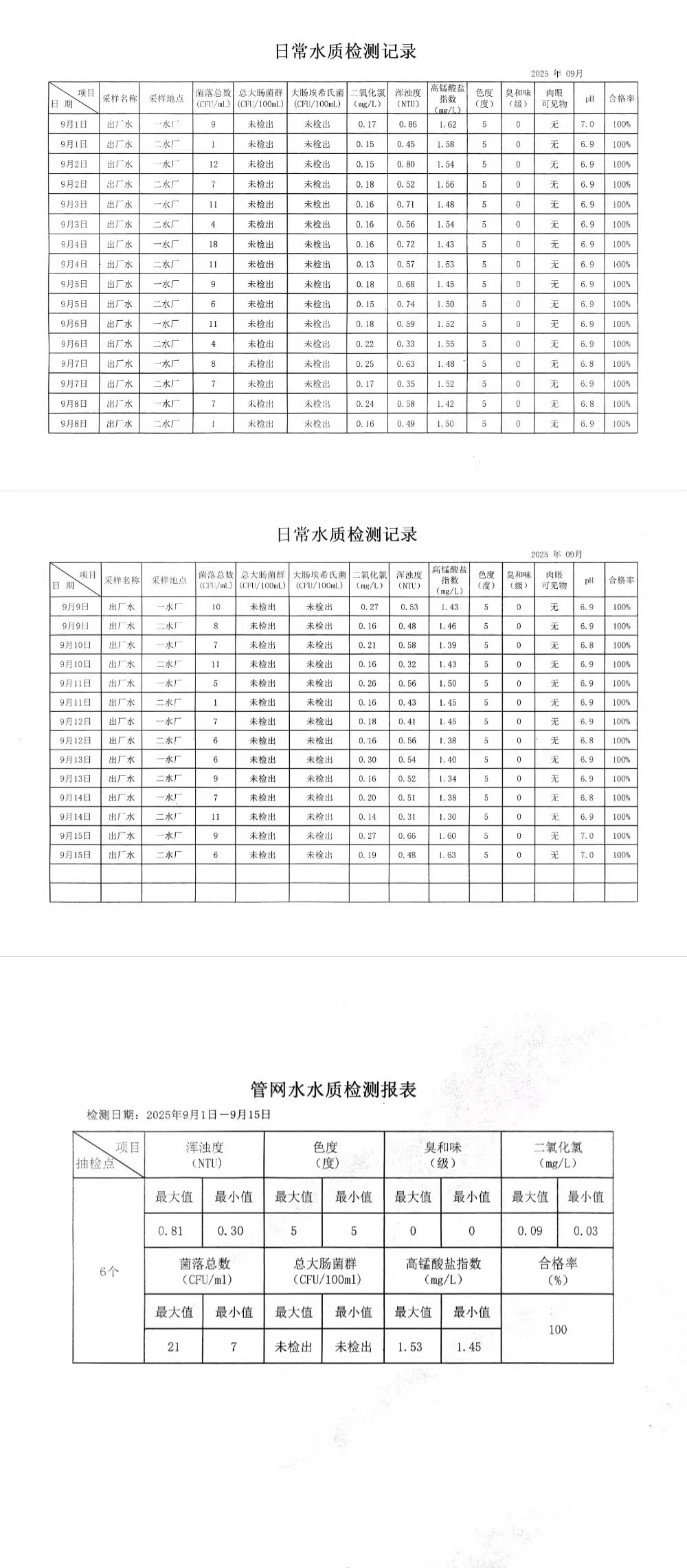 2025年9月上半月兴临自来水公司日检、半月检水质信息公开