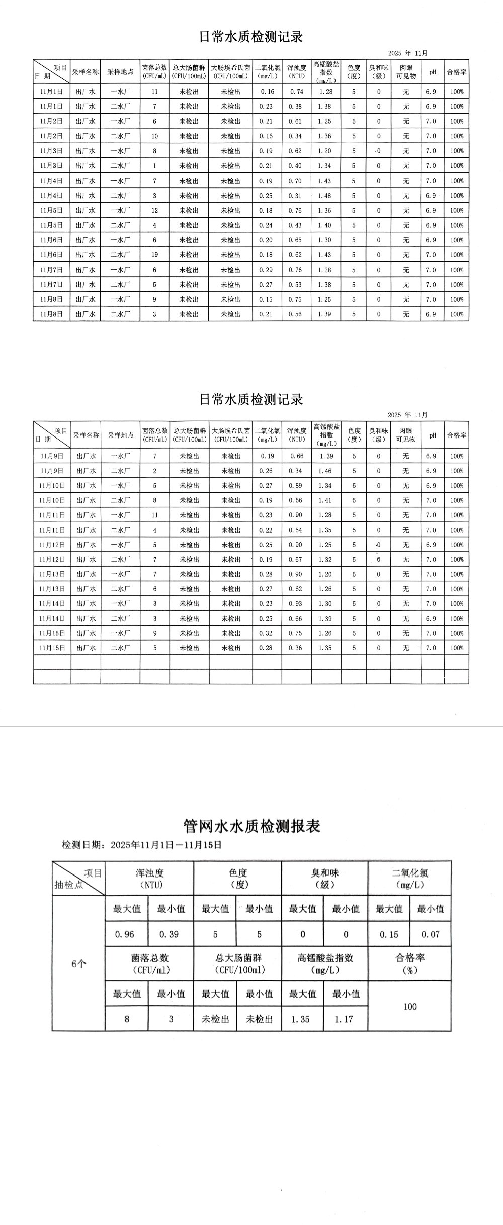 2025年11月上半月兴临自来水公司日检、半月检水质信息公开