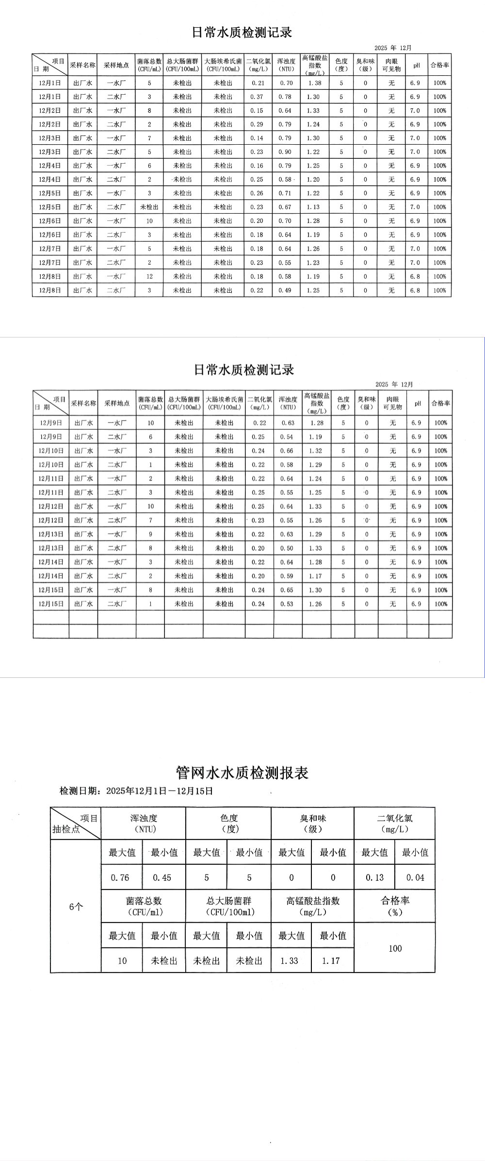 2025年12月上半月兴临自来水公司日检、半月检水质信息公开