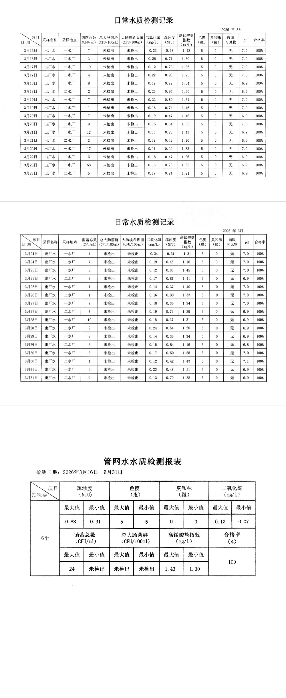 2026年3月下半月兴临自来水公司日检、半月检水质信息公开