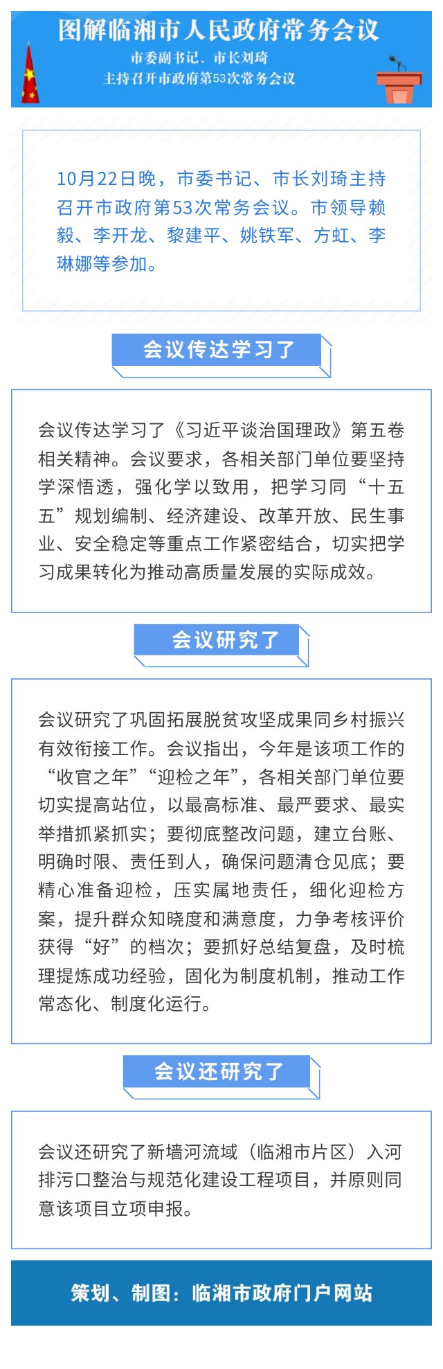 10月22日晚,市委书记、市长刘琦主持召开市政府第53次常务会议。市领导赖毅、李开龙、黎建平、姚铁军、方虹、李琳娜等参加。
