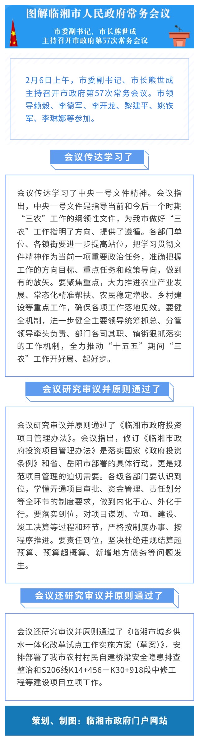 2月6日上午,市委副书记、市长熊世成主持召开市政府第57次常务会议。市领导赖毅、李德军、李开龙、黎建平、姚铁军、李琳娜等参加。