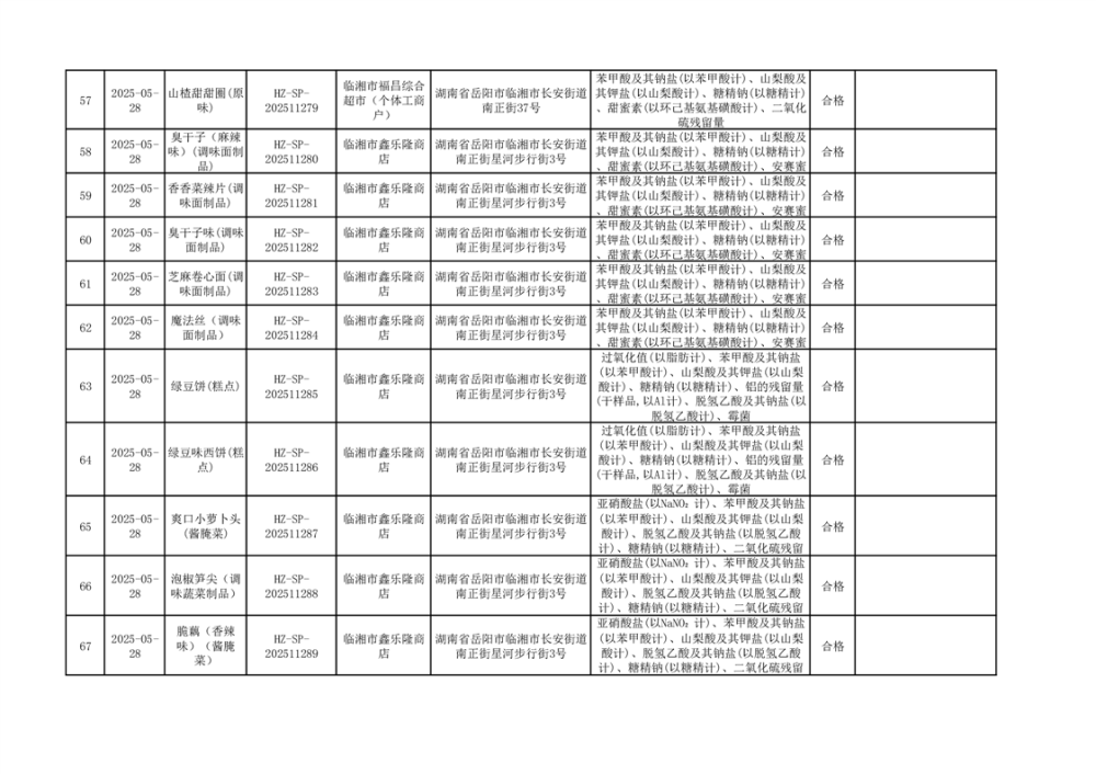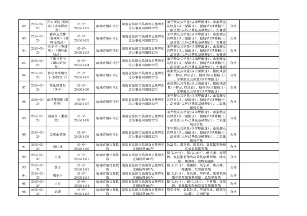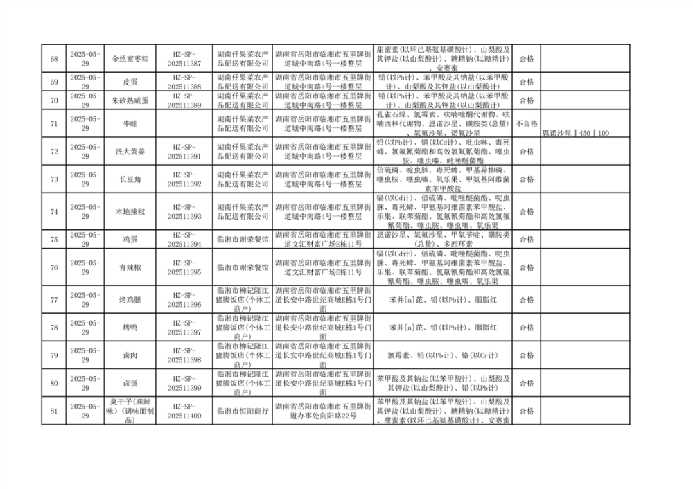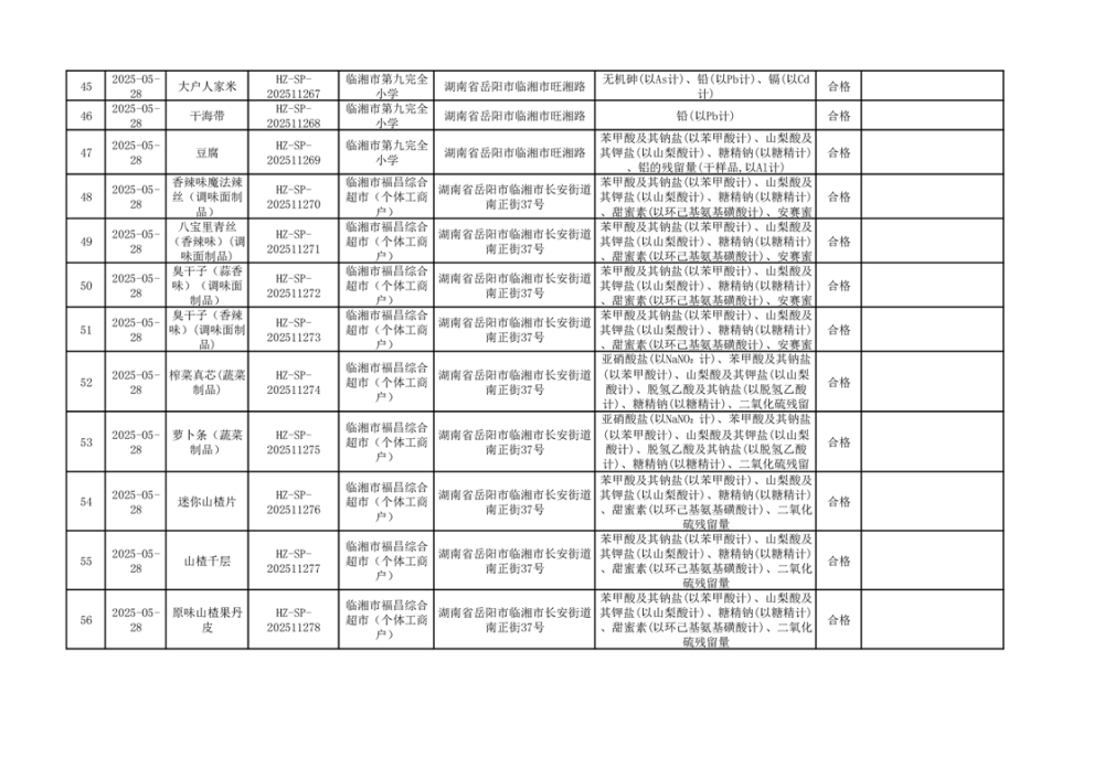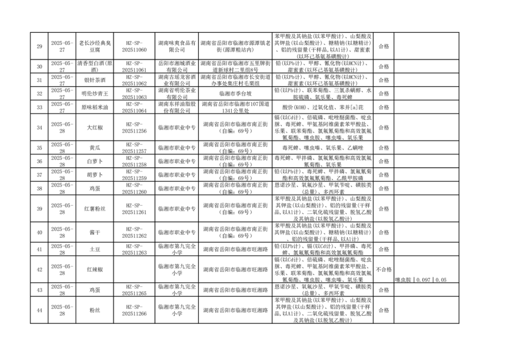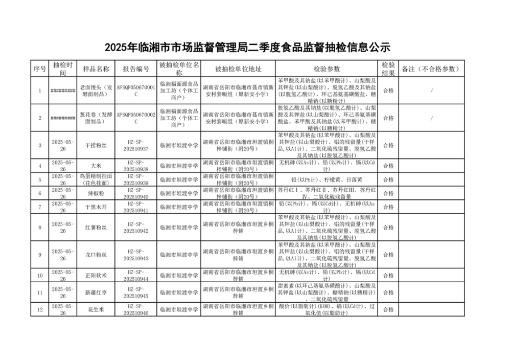 2025年临湘市市场监督管理局二季度食品监督抽检信息公示