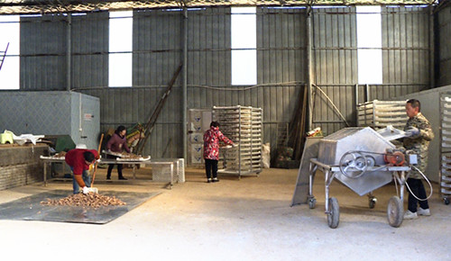 方正刚和工人们正在加班加点将烘好了的黄精倒入黄精脱毛机中去须后进行晾晒。他们要将黄精赶着发往福建、深圳。看着这些黄精,方正刚心里非常高兴。