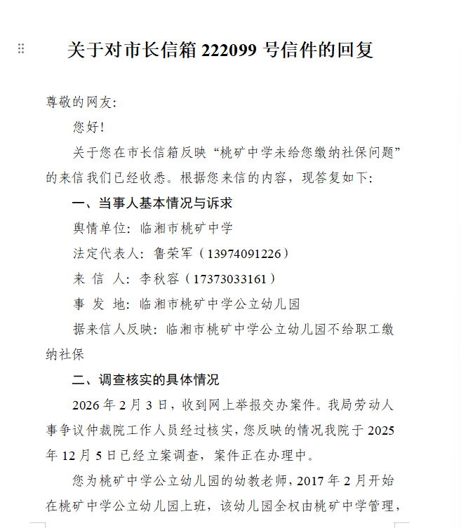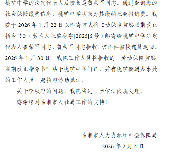 临湘市教育局、关于依法解决桃矿中学 公立幼儿园职工(李秋容) 补缴9年社保及报复性非法裁员的请求 尊敬的临湘市教育局领导! 辛苦你们了,在你们的努力工作下,;临湘教育事业蒸蒸日上,为国家培养了无数高科技人才,我们桃矿中学公立幼儿园教师,从2017年2月(入园)至今(2026年2月),把宝贵的青春献给了教育,培养了无数祖国的花朵,却换来老无所养,无依无靠,流落街头的悲惨处境, 2026年的今天,桃矿中学还存在,在职职工不缴社保的法外单位,职工怨声载道,无论工作多少年,不缴社保,裁员不赔偿,多少裁员员工痛哭流泪,含泪而去,工作一辈子也无法退休,老无所养,谁能接受?中央社保法明文规定,任何单位必须为职工依法强制缴纳社保,老有所养,可我们湖南省、临湘市、桃矿中学公立幼儿园校长把劳动法当儿戏,单位9年不给职工依法缴纳、补缴社保,与职工签订劳务合同,只签订一份,保存到学校,应付上级检查,欺骗上级,不给职工劳务合同,禁止职工对劳务合同拍照,复印等行为,单位此行为已涉嫌严重违法,校长多次无视劳动监察部门的通告,拒不接受劳动法,处在劳动法之上,校长公开挑战劳动法,坚持与劳动法抗争到底,国法难容,职工多次要求单位领导依法缴纳社保时,校领导还主张职工上告,说是劳动法对单位无效,不接受劳动法,上级检查单位时,校领导第一反应不是想办法,为职工解决社保问题,而是想尽千方百计抵抗劳动法,与劳动法抗争到底,决不为职工缴纳一分钱社保,职工反而遭到报复性非法裁员,违法压倒维权,校长身为教书育人,还怎能为人师表? 如果我们湖南所有单位都像校长这样将劳动法抗争到底,不为职工缴纳社保,还能取得最后胜利,并将合法维权人报复性裁员,辞退,那我们湖南社保系统即将奔溃,解体,危及国家社保系统安全,党和国家能答应吗?此事实已向全国知名网址及新闻媒体发布后,受到了全国网友的同情与支持,老有所养,依法强制为职工缴纳,补缴社保是基本国策,任何单位不得抵抗,此事件同时也得到省人社厅,省政府,市人社部门的高度重视,正处立案调查中,已取得初步调查进展,相信党和国家一定会给职工一个公道,会给法律一个尊严。 强烈青求临湘市教育: 一、请求临湘市教育局协助桃矿中学帮助职工(李秋容)补缴9年社保的合法权益,及时解决职工缴纳社保问题。 二、及时纠正校长报复性(合法维权)非法裁员的错误。 三、规范学校领导,不缴社保,不签劳务合同或者只签一份的违法违纪行为,及时纠正错误。 四、严肃处理学校领导,非法裁员,报复性(维权)裁员,裁员不按劳动法补偿的违法行为,裁员必须先向上级劳动监察,教育部门报备审核,按劳动法补偿合法裁员。 请求人:李秋容 联系电话:17373033161 湖南省劳动监察大队核实情况 联系电话:0731-84900102 临湘市劳动监察大队核实情况 联系电话:0730-3977391 2026年2月3日 附件1:01.jpg 附件2:02.jpg 附件3:03.jpg 附件4:04.jpg 附件5:05.jpg 附件6:06.jpg 附件7:07.jpg 附件8:08.jpg 附件9:09.jpg 附件10:10.jpg 附件11:11.jpg 附件12:12.jpg 附件13:13.jpg 附件14:14.jpg |