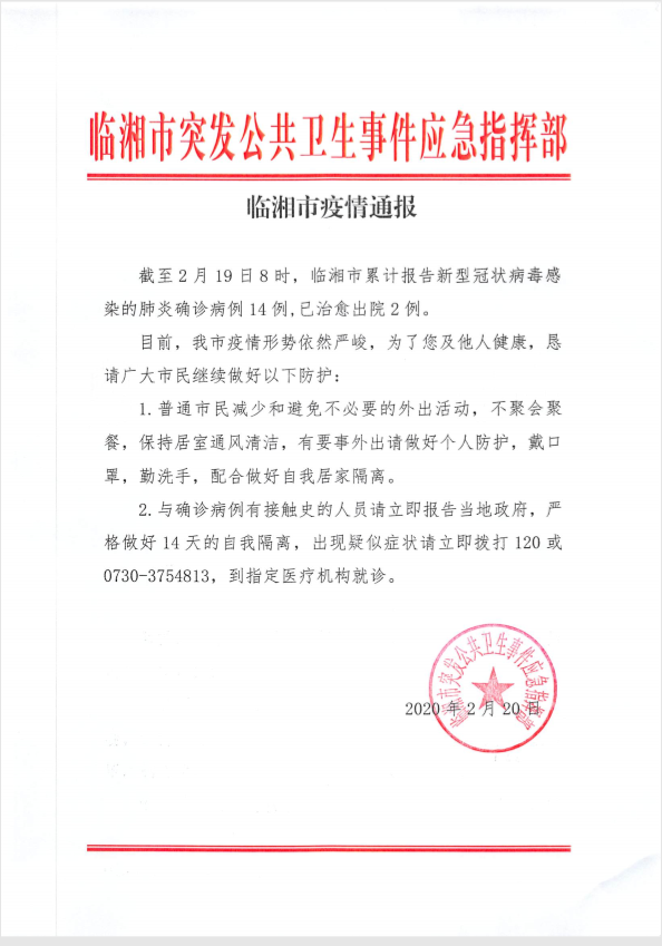 临湘市疫情通报(2月20日)