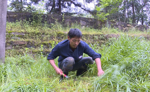 一大早,勤劳的郑建伟就将牛棚里的大牛牵到自家田里放养。系好牵牛的绳子后,还要割一大捆专门种植的黑白草回来给小牛吃,真是一点工夫都不耽误。