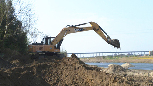 11月18日上午,记者在项目施工现场看到,机声轰鸣,几台挖机正在进行河道清淤和整坡作业。