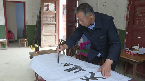 深秋的清晨,大和村还笼罩在一片薄雾之中。但此时村民涂复光老人已经开始在家中挥舞笔墨练习书法。只见老人聚精会神、目不转睛地挥毫,不一会儿功夫,苍白的宣纸上便填满了老人苍劲有力、行云流水的书法作品。