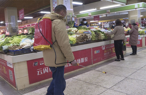 长安市场管理所副所长李校东:“现在临近年关,市场人流量比以前大了很多。所以我们除了加强来往人员的管控,每天早中晚还对主要通道和重点区域进行三次防疫消杀。”