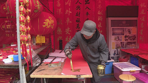 在城区南正街、大市场等人流量大的地方,一些书画能手正在指定的场所,摆起案桌,挥毫泼墨,现场书写春联。部分商家也备足了春联、年画、灯笼等迎春喜庆饰品,营造出一派喜庆祥和的节日氛围,引得不少市民驻足选购。