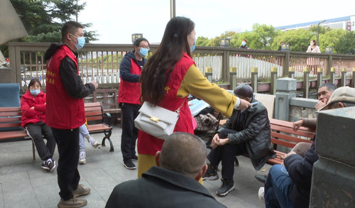 青年志愿者:“老人家,您出来一定要将口罩戴好。” 市民:“好的、好的,谢谢!”青年志愿者:“现在是疫情防控期间,特殊情况,谢谢您的配合。”