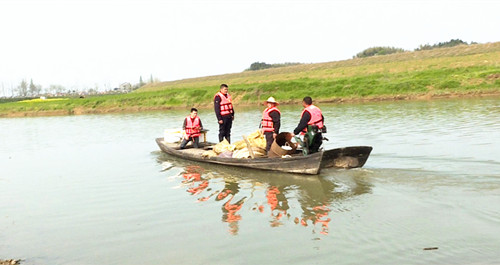 此次投放品种为田螺、石螺蛳、河蚌等贝壳类。投放现场,工作人员将一箱箱螺蚌抬至渔船上,沿源潭河土咀垸省控断面水质监测点而行,均匀的“洒”在水中。