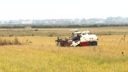 长塘镇长塘社区种粮大户柳飞虎:“我今年种了450亩的晚稻,由于今年长期干旱,我们克服了种种困难,现在我们正在机收,从收上来的谷子来看,亩产能够达到1000斤,比去年同期增产60斤左右。”