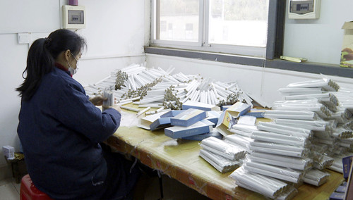 在湖南省高圣生物科技股份有限公司的生产车间,工人们正在加班加点地赶制抗疫菌艾香、足浴包等艾草制品。工厂车间里机器轰鸣,一根根“雷火透灸柱”经过压形、塑膜、装盒等工序后,迅速发往全国各地市场。