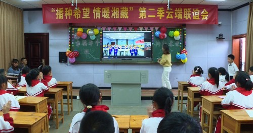 通过云端视频连线,湘藏少先队员们在与对方热情友好的打招呼后,我市少先队员们表演了手势操、朗诵、古筝弹奏等节目,分享了读书体会、交流了梦想。西藏少先队员们也通过屏幕介绍了自己的学校、当地的风土人情、表演了合唱节目。