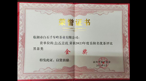 近日,在岳阳市举行的“岳阳黄茶·万人品茗”活动上传出喜讯,我市白石千车岭茶业公司生产的“白石青砖”荣获2023岳阳名优茶评比黑茶类“金奖”。