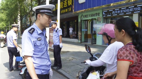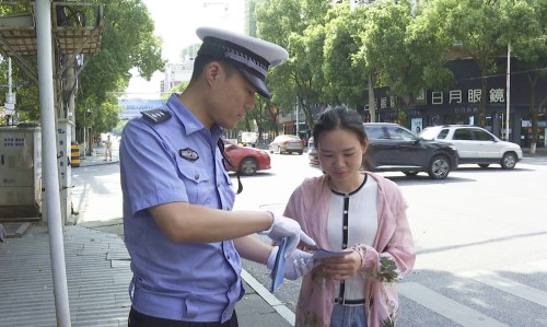 市公安交警大队辅警姚令霞:“前面那位穿白色上衣的大哥把头盔佩戴好啊,一定要戴好安全头盔,”