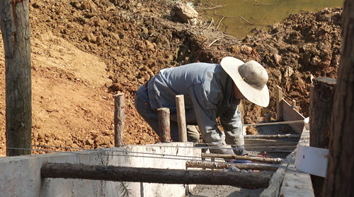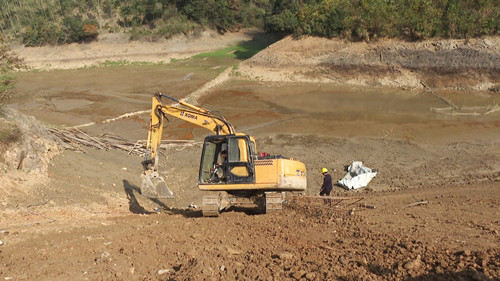 11月23日,在聂市镇朱圣村桃冲水库除险加固工程项目建设现场,大型挖掘机来回穿梭整理护坡,工人们正忙着装模、坝体充填灌浆等作业,大家分工合作、现场有条不紊。