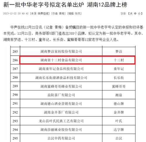 近日,国家商务部公示了新一批“中华老字号”拟认定名单,我市“十三村”品牌名列其中。