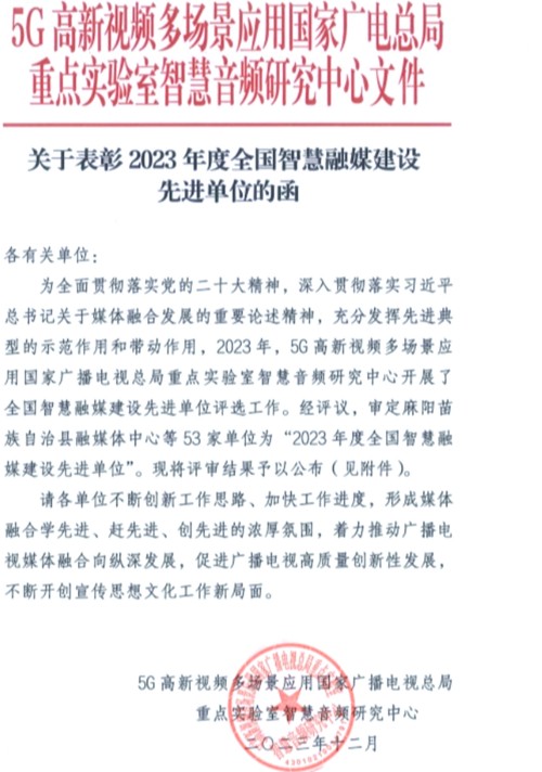 近日,5G高新视频多场景应用国家广播电视总局重点实验室智慧音频研究中心公布了2023年度全国智慧融媒先进单位,我市融媒体中心榜上有名。