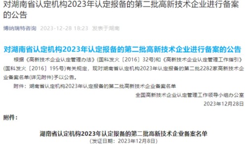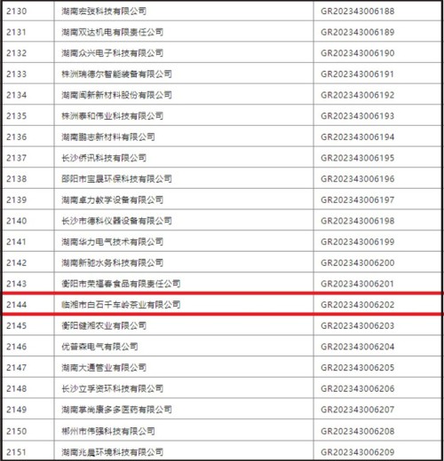 近日,全国高新技术企业认定管理工作领导小组办公室发布《对湖南省认定机构2023年认定报备的第二批高新技术企业进行备案的公告》,湖南省2282家企业获得认定。其中,我市白石千车岭茶业有限公司榜上有名。