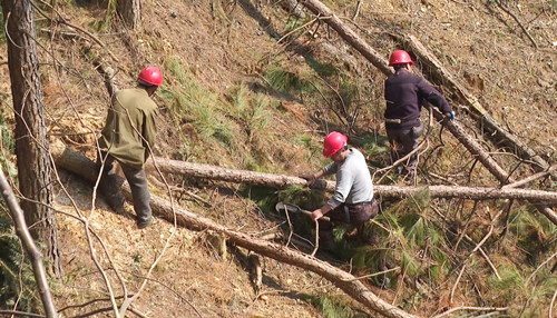 记者沿荆竹山山道驱车向上,来到国有林场顶部,放眼望去,林场内的防火通道已完成清理畅通无阻,但林地内不少树木被冰雪拦腰折断或压倒,全场有九十多名工人分工协作,有序将残枝断木进行清理运走,并重新种上赤皮青冈、楠木、青冈栎、苦槠等树种。