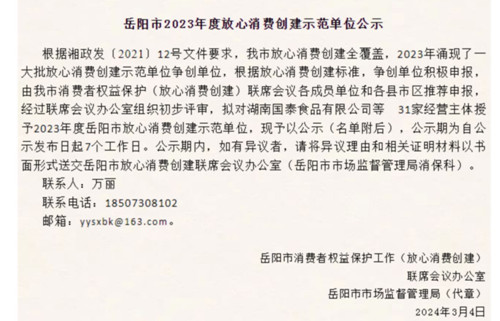 我市两企业获评岳阳市2023年度放心消费创建示范单位