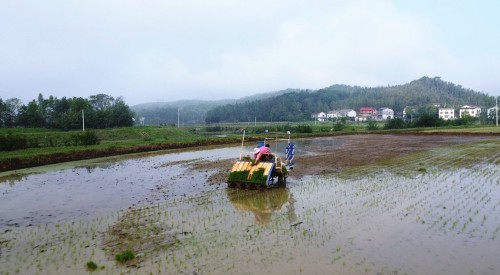 机械抛秧,助力农忙。在五里牌街道楠木村千亩高标准农田示范基地,村民们忙着将一盘盘嫩绿的秧苗搬上插秧机,伴随着机器轰鸣,插秧机在水田里来回穿梭,青翠的秧苗被均匀地插入水田中,原本光亮如镜的水田披上了一袭“绿装”。