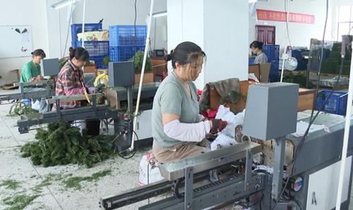 在长塘镇乡贤谢先圣投资兴建的石田晋昇公司生产车间,工人们正在流水线上忙着拉叶、切草、绑枝、组装圣诞树。圣诞树制成装柜后,将由公司统一销售。