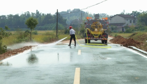 10月10日上午,记者在坦渡镇桐新线看到,工作人员正在冲洗路面,一条干净宽敞的柏油路让人眼前一亮。