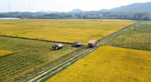 在五里牌街道楠木村的高标准农田示范基地里,成片的农田里稻浪滚滚,颗粒饱满的稻穗压弯稻杆,空气弥漫着淡淡稻香。农机手驾驶收割机在稻田里往返作业,稻谷经过脱粒、碎杆等工序后被送入机舱,然后输送到运粮车中,田间一派繁忙景象。