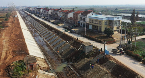 在江南垸灌区续建配套与节水改造工程建设现场,工人们正在进行现浇混凝土护坡、格宾笼护脚等作业,现场一派繁忙。该项目总投资9119万元,国债到位资金6380万元,涉及江南镇7个行政村,设计灌溉面积7.5万亩。目前,已建设完成泵站6座,水闸4座,农桥2座,干支渠衬砌5200米。