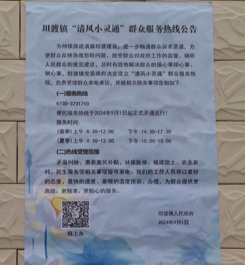 今年来,坦渡镇针对群众身边的不正之风和腐败问题,创新推出“清风小灵通”民生服务热线,确保群众诉求能够得到及时回应和有效解决。