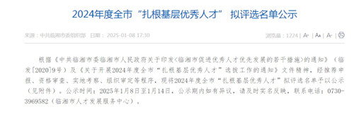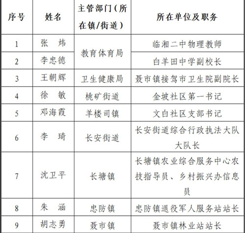 近日,市委组织部公示了2024年度“扎根基层优秀人才”评选名单。忠防镇退役军人服务站站长朱涵、临湘二中物理教师张炜、白羊田中学副校长李忠德、聂市镇接驾市卫生院副院长王朝辉、桃矿街道金坡社区第一书记徐敏、羊楼司镇文白社区支部书记邓海霞、长安街道综合行政执法大队大队长李琦、长塘镇农业综合服务中心农技指导员、乡村振兴办信息员沈卫平,聂市镇林业站站长胡志勇榜上有名。