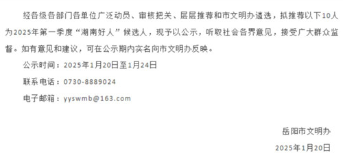 近日,由岳阳市文明办推荐的2025年第一季度“湖南好人”公示名单中,我市两人成功入选。其中,临湘市果品有限公司董事长谌玉海入选诚实守信类“湖南好人”,聂市镇新安村卫生室村医张国英入选敬业奉献类“湖南好人”。
