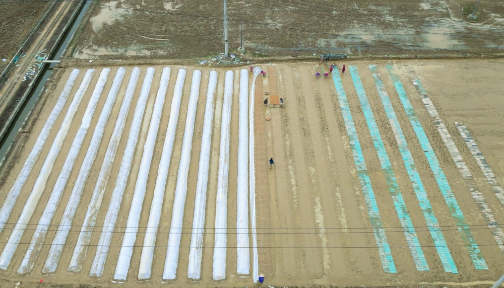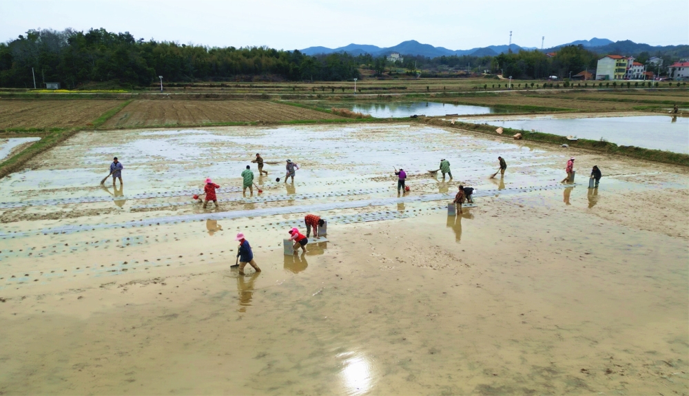 在云湖街道王禾高标准农田种植基地,一幅繁忙的春耕画卷正徐徐展开。农户们脚穿雨靴,手持工具,熟练地将育秧托盘整齐铺设在田地上,随后,播撒种子、回土填泥、覆膜保暖等一系列工序有条不紊地进行着。大家分工协作,干劲十足,田间地头洋溢着春耕生产的勃勃生机。